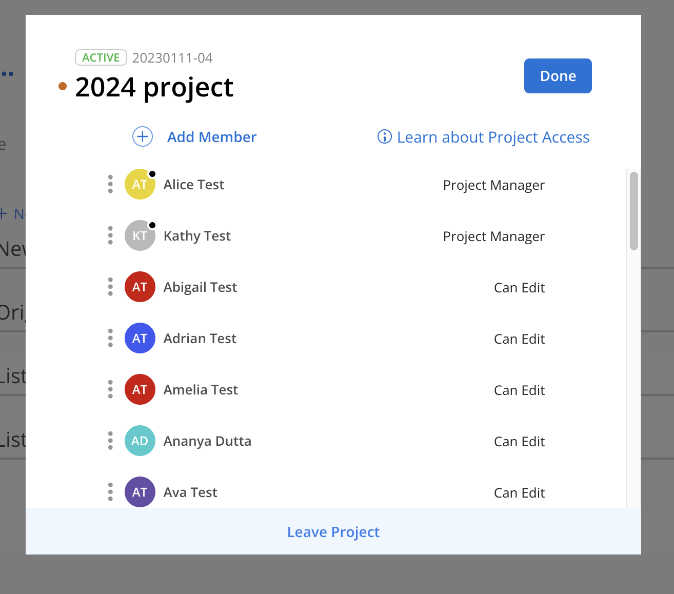 Member Management Modal displays all Project Members in a structured order to improve visibility and access: