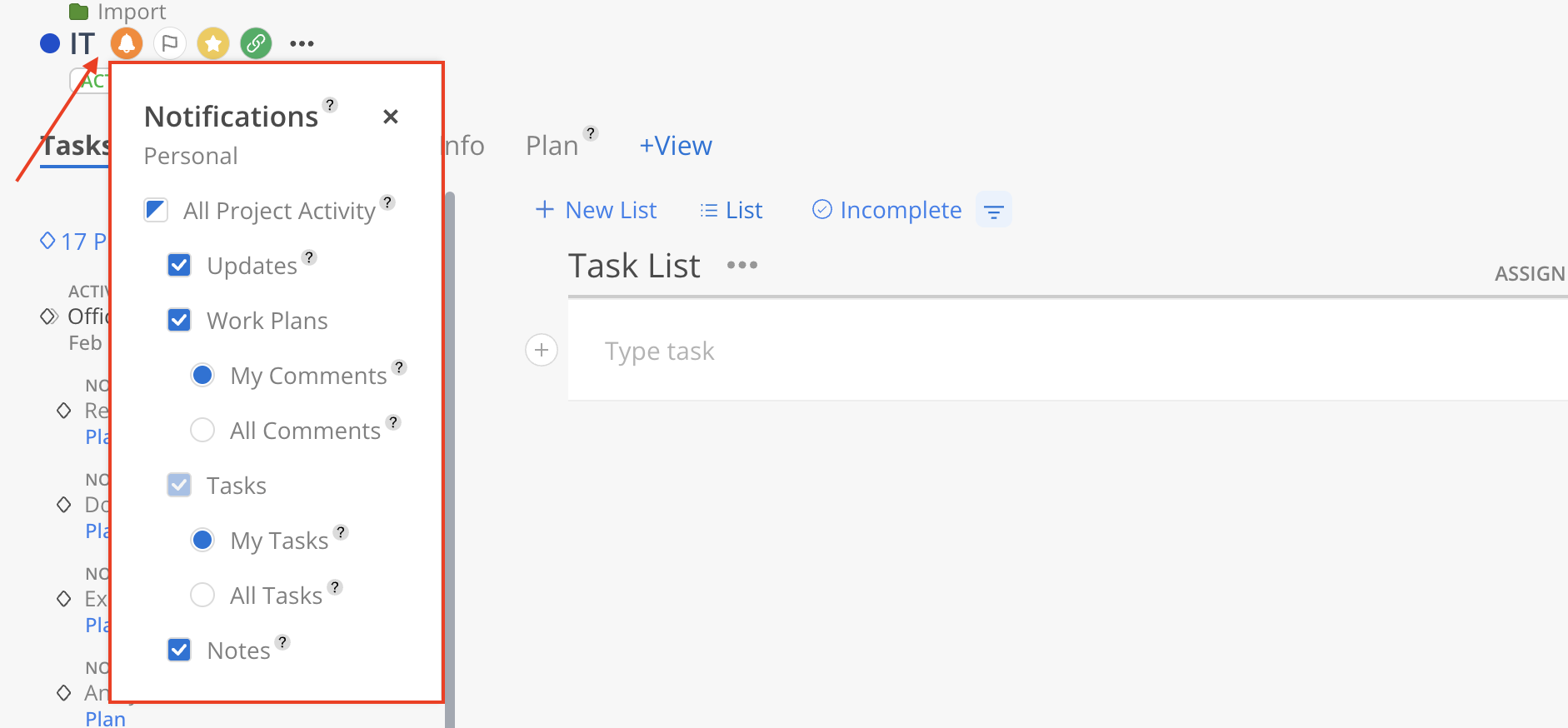 All Project Activity: Get notified about all activity on this Project, including updates, tasks, notes, and Work Plans.