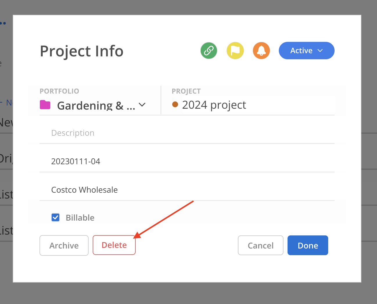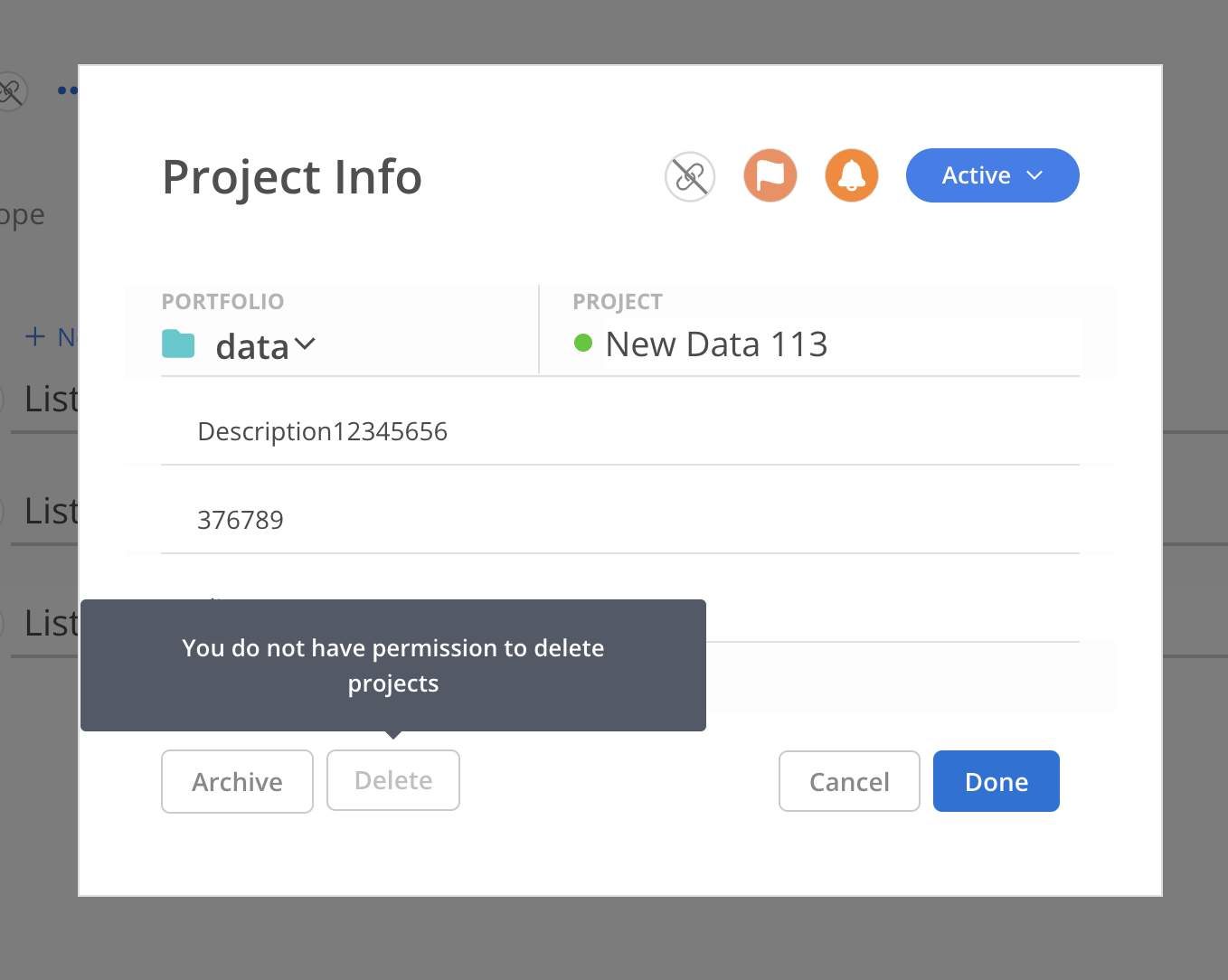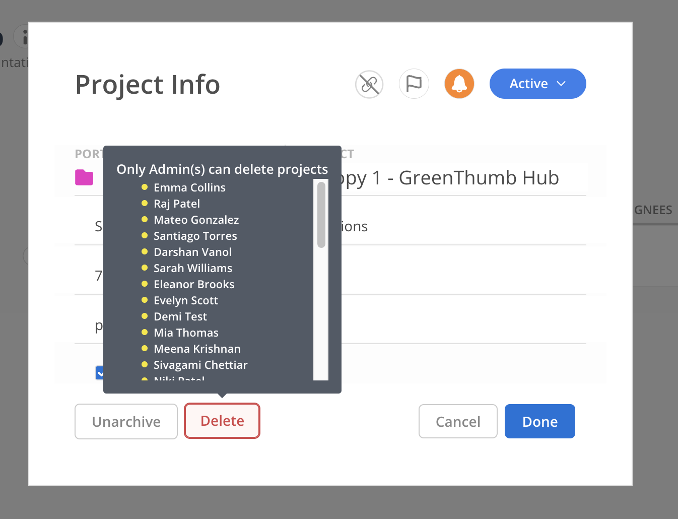 For projects that are already archived, the Delete button will appear in the Project Info Modal. Only Admins are allowed to delete projects. Hover over the button to see a list of Admins.