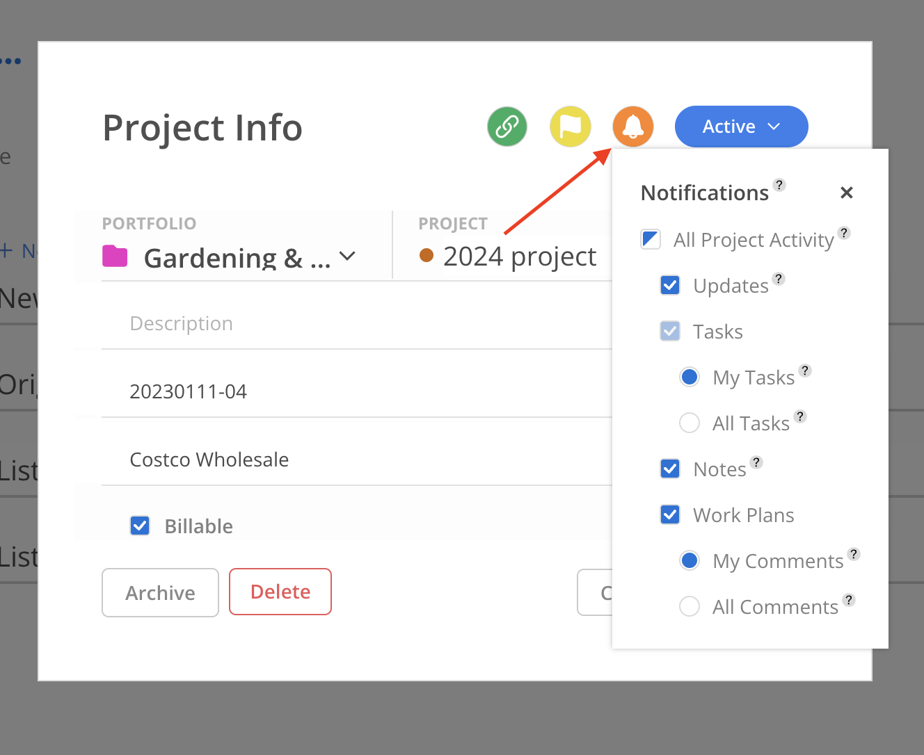 Edit Project notification setting by clicking the bell icon to receive only notifications on Project Updates, Tasks, Notes, and/or Work Plan comments.