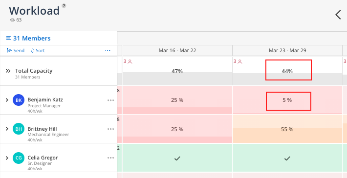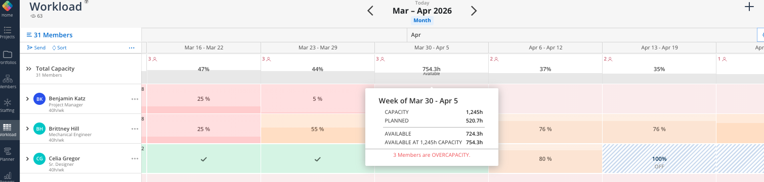 In the Workload Space, you can view the total capacity of all selected members on the Top Summary Row. Individual capacity can be viewed by hovering over each member's row.