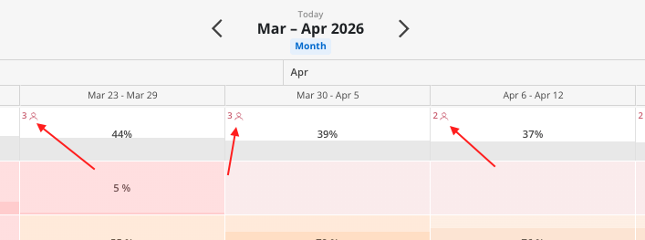 If any member is overcapacity during the date range of the cell, a red user icon with the member count will appear in the top left corner. Hover over the cell to see the number of overcapacity members and detailed capacity information.
