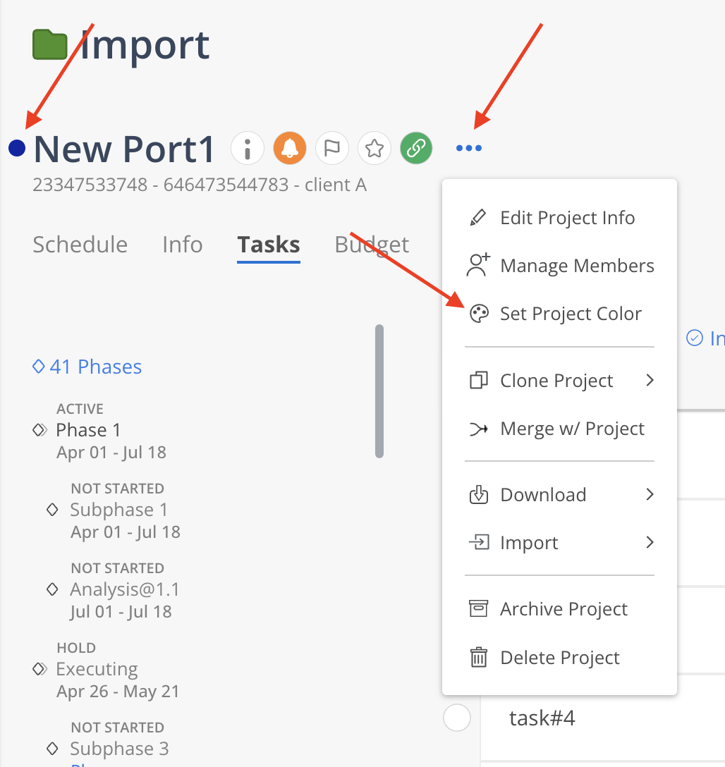 Click the color dot next to the Project title, or open the three-dot menu and select Set Project Color.