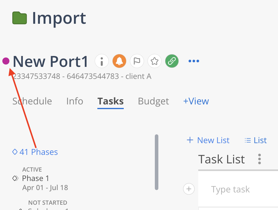 Top Left Corner: Project information, including the Portfolio name and color, Project name and color, Project number, Project client.
