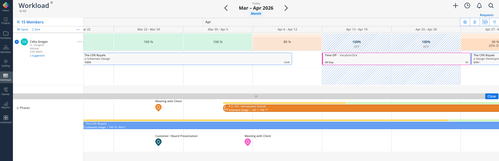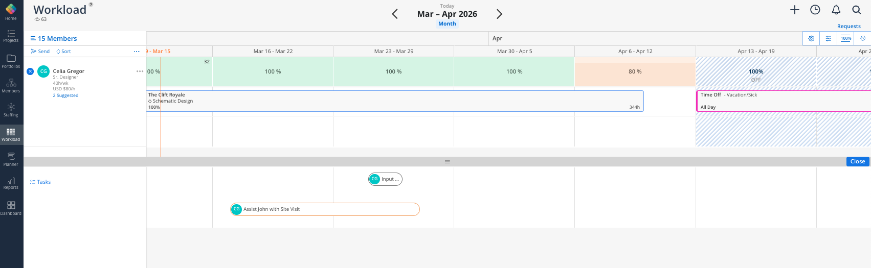 View Scheduled Tasks: Selecting this option allows you to see Tasks assigned and planned for the Member from their projects. You can also click Tasks on the top of the split view to see Tasks that are assigned to the selected Member but have no dates. Select Close to close the split screen view.