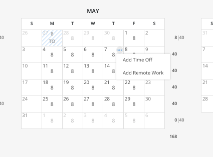 Depending on your Access Level, you can enter time-off for team members here as well. Select the three dot menu next to a specific date and select the Add Time Off to open up a new blank TO work plan for that member.