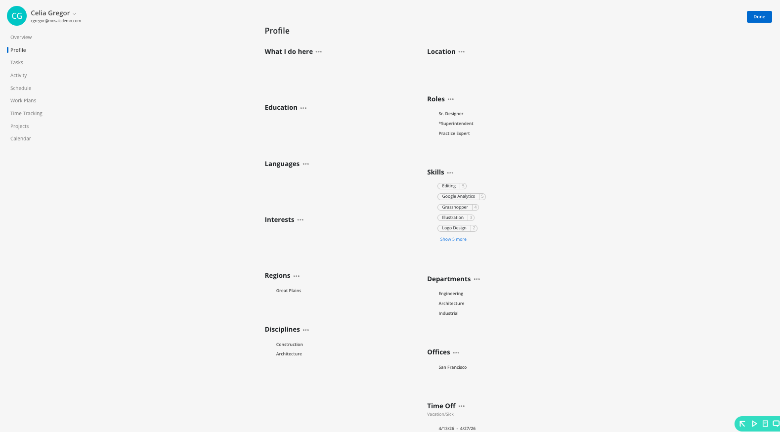 Member Profile: Selecting this option will open the profile tab in the Member Modal - which contains details of what that Member roles are - as well as other attributes available (such as education, organizational attributes, and TO (or time off) scheduled). Select Done to close this window.