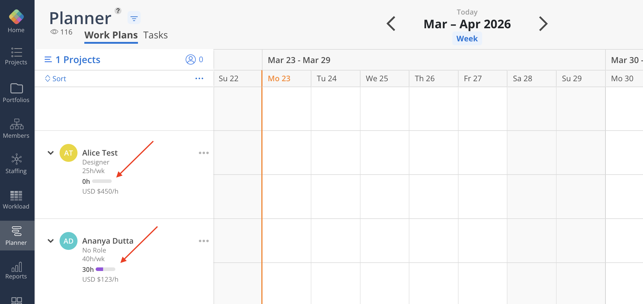 Expand each member row in the Planner timeline to see a purple utilization bar that reflects their current capacity usage across assigned work plans. This bar gives you an at-a-glance view of how fully booked a member is without needing to navigate to the Workload space.