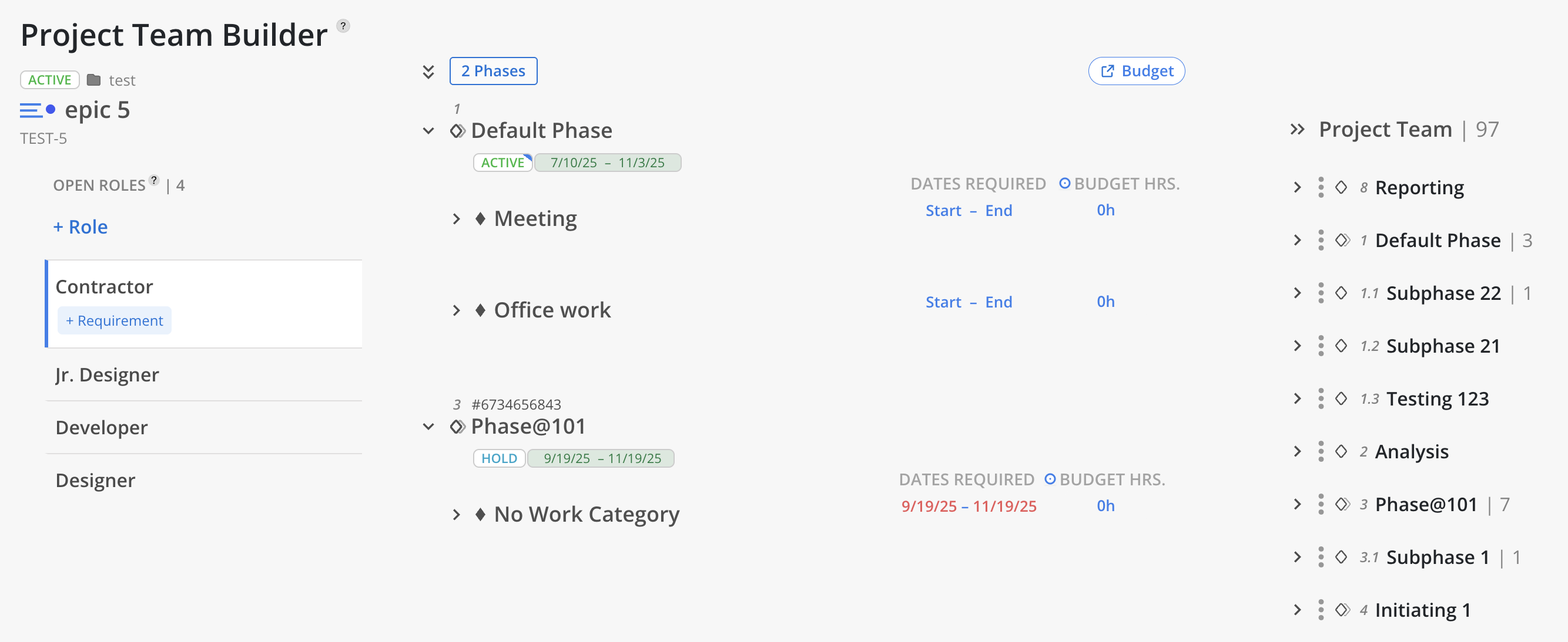 Click Team Builder on the menu, and the Project Team Builder modal will display, where you can add open roles, assign phases, set date ranges and budget hours, evaluate best matches, and add specific requirements for roles.