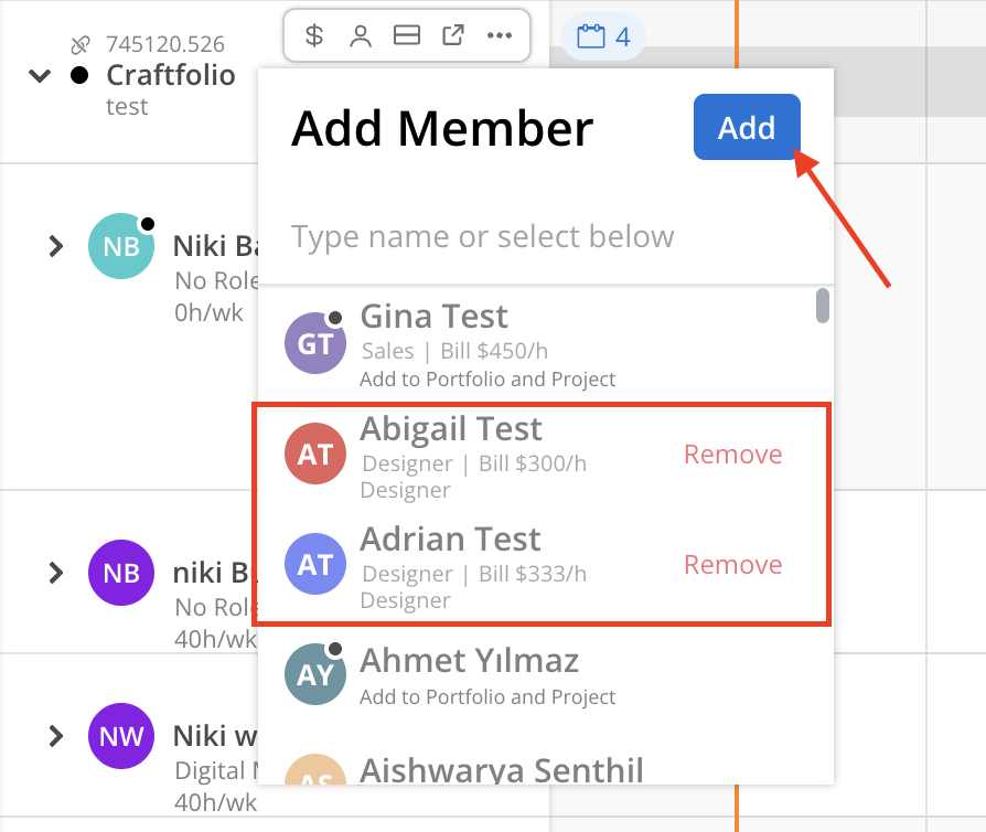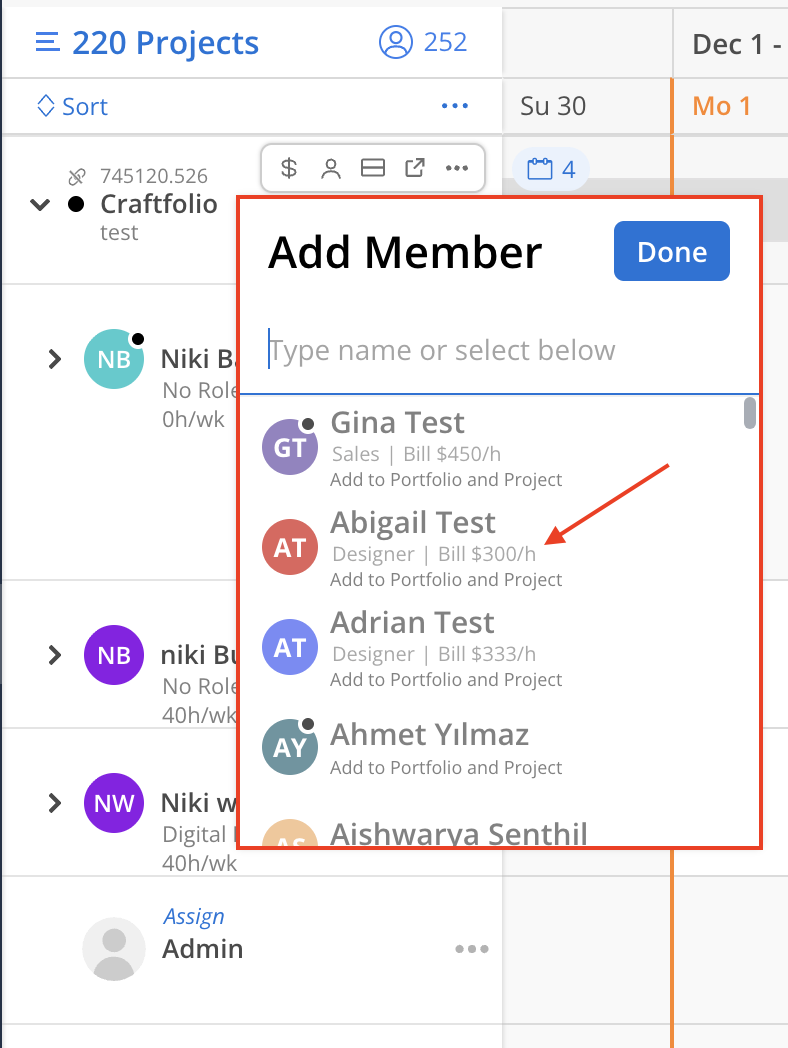 A list of Members will be displayed. Use the search bar to quickly locate the Member. If the Member has a default Role, Bill Rate, and Cost Rate, this information will appear beneath the Member’s name.