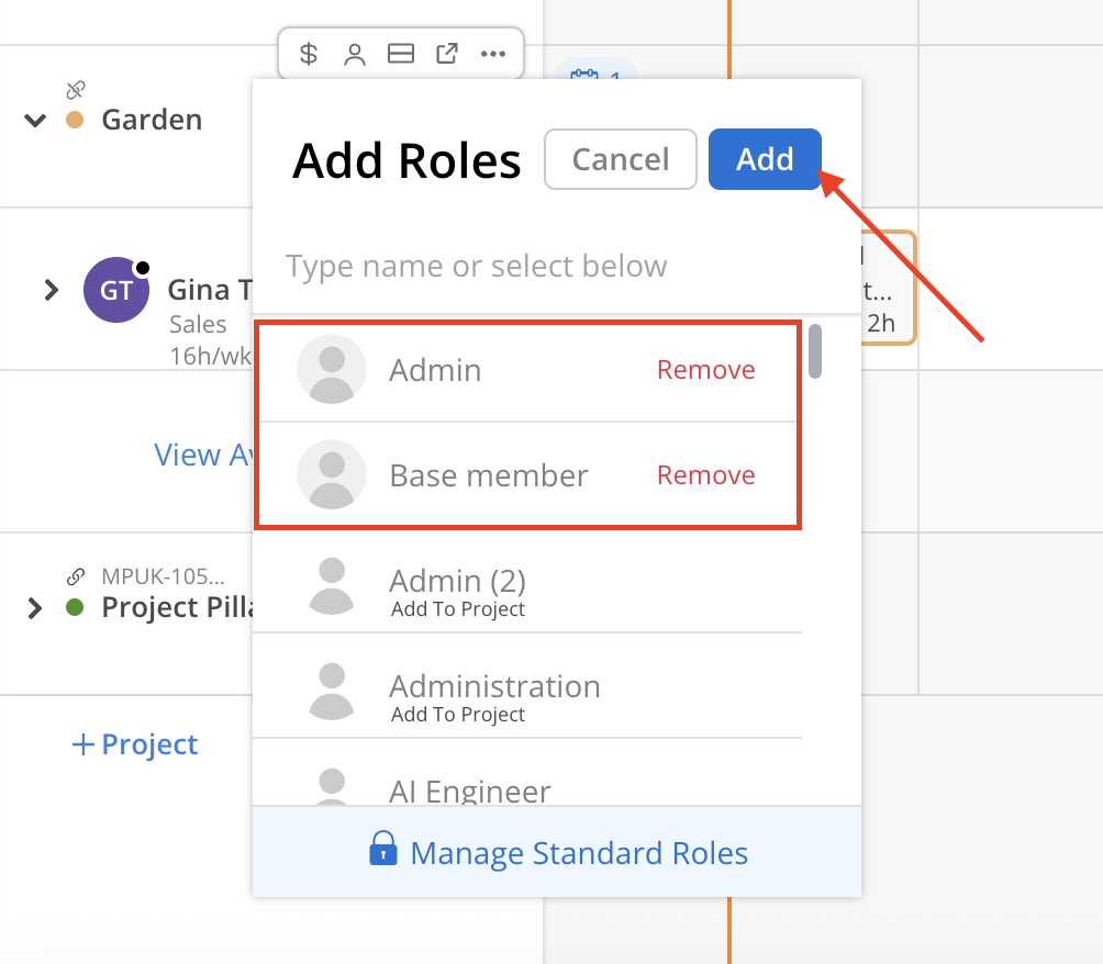 A list of Open Roles will be displayed.Select the Open Roles to add, then click Add on the top. You can search by the Open Role’s name. Click Manage Standard Roles will open a new page to Organization Settings > Standards > Roles, only Admins have access to this page.