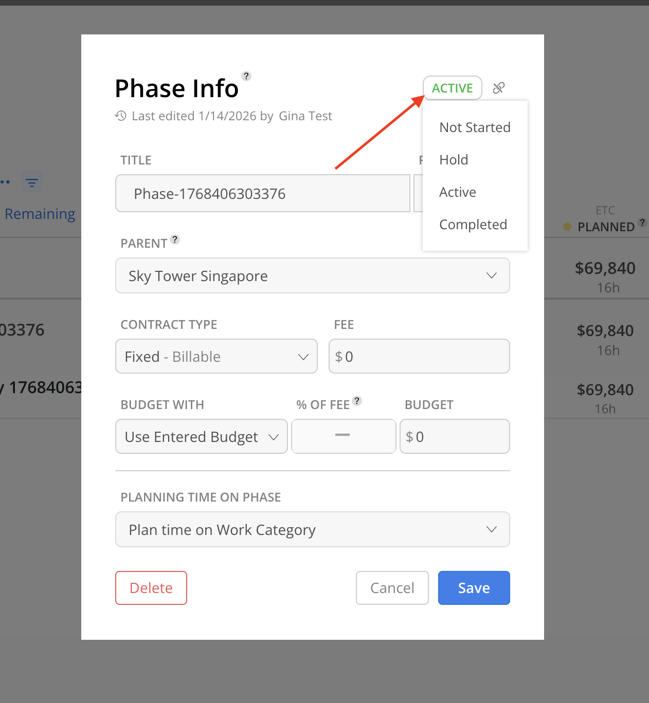 On the Phase Info Modal, select the dropdown in the top right corner to select the Phase status. Available statuses are Not Started, Hold, Active, Completed. Click Save to close the modal.