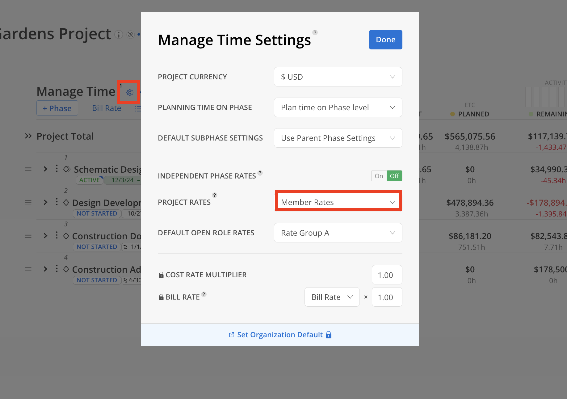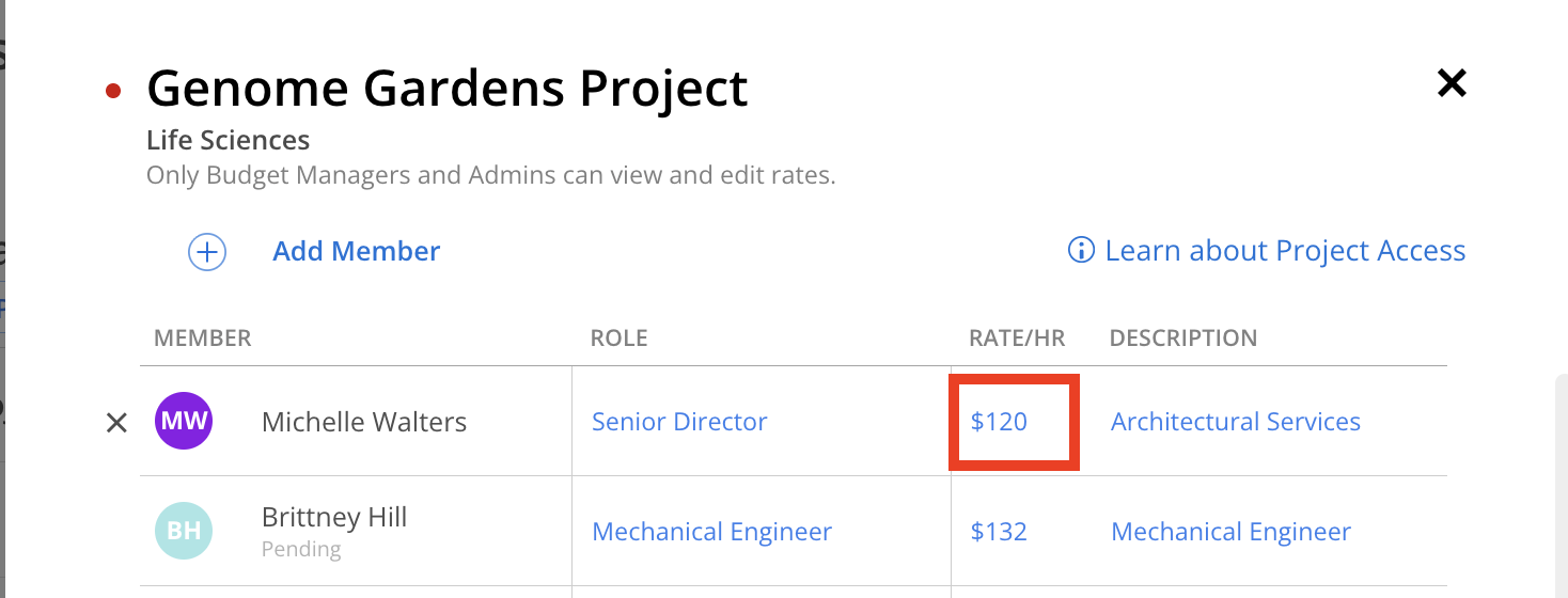 Tip: The updated rate applies only to this project. The member’s default rate in your organization settings remains unchanged.