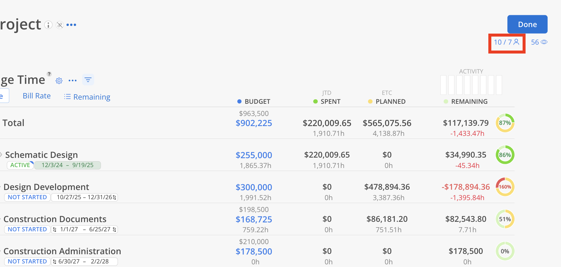 Click the person icon in the upper-right corner of the Budget space to open the list of team members assigned to the project.