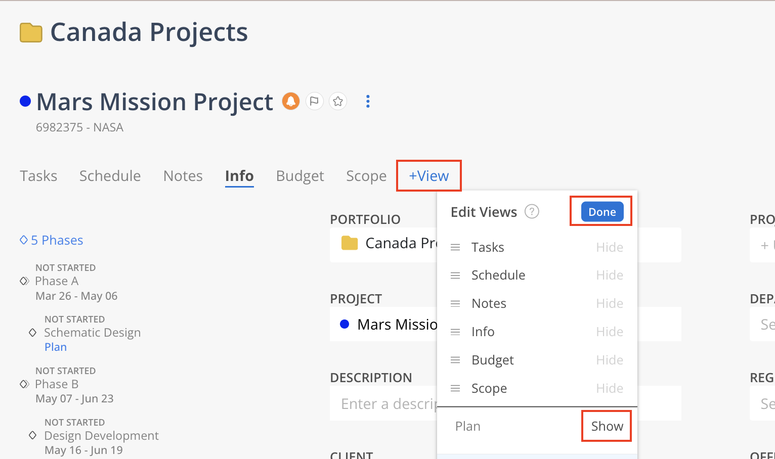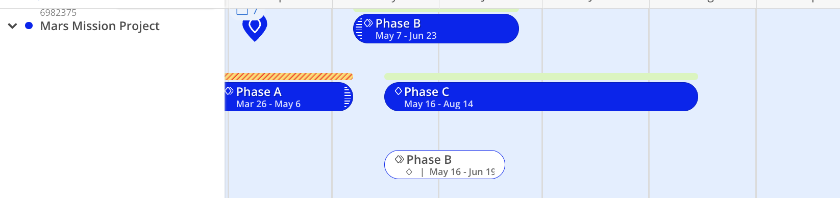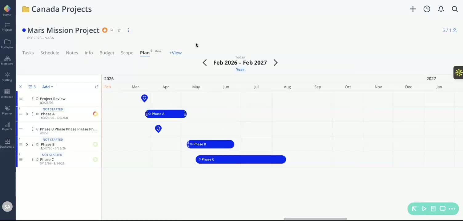 The Plan space in Mosaic gives you a visual, Gantt-style view of your project schedule so you can plan, organize, and manage phases, sub-phases, and milestones over time.