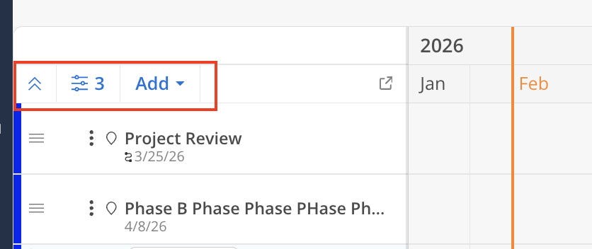 In the top-left corner of the Plan view, you’ll find controls that help you manage how your project schedule is displayed.