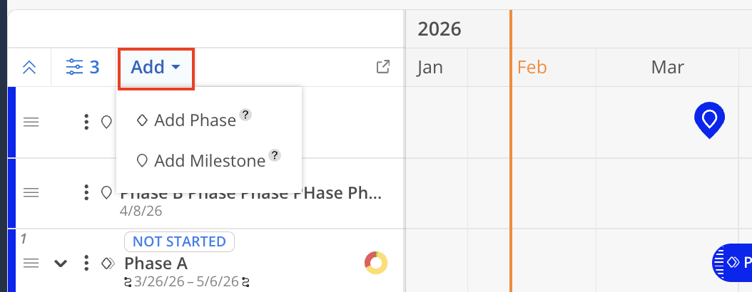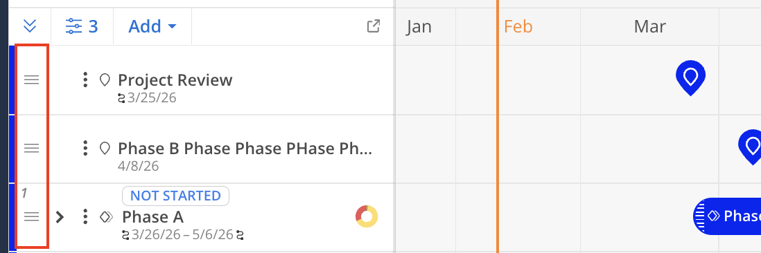 For phases and sub-phases, a number appears above the three-line icon indicating their current order in the project schedule.