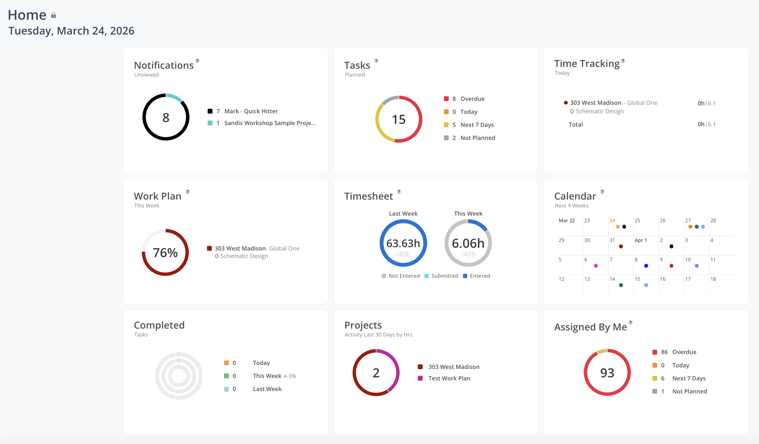 The Home space provides a consolidated view of your individual work in Mosaic, bringing together key information to help you stay informed and organized. It is designed to give visibility into your tasks, time, and project activity, enabling you to quickly understand what requires your attention.