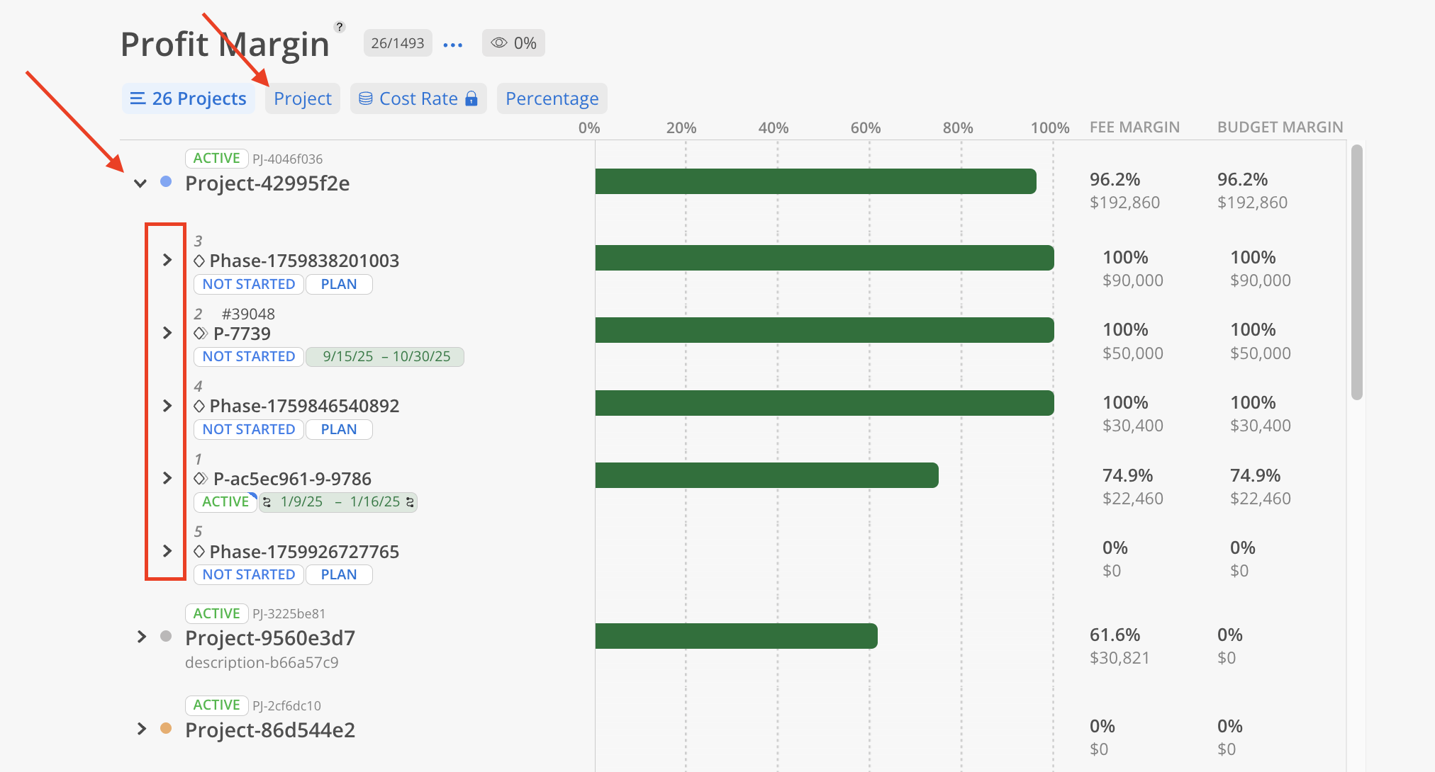 Expand a Project reveals a detailed breakdown of profitability by Phases and Subphases, allowing for deeper analysis of where profits are being generated or lost within the Project structure.