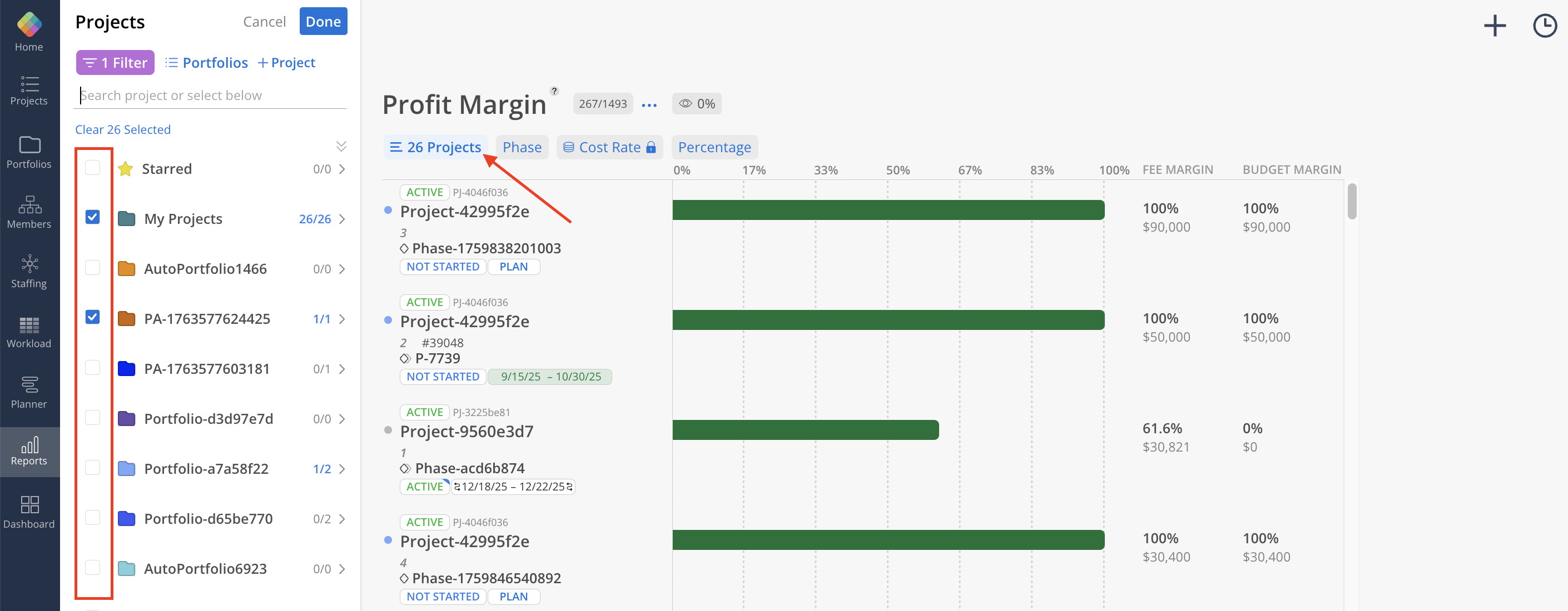 Use the checkbox next to a Portfolio to select all Projects within it, or check individual boxes to select specific Projects for viewing.
