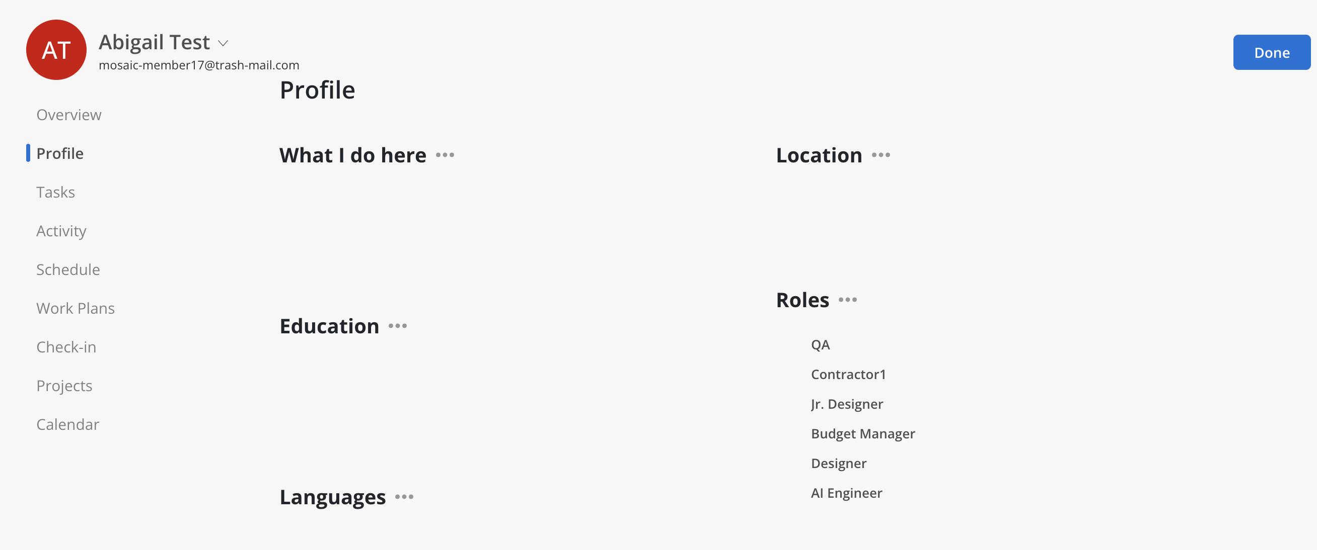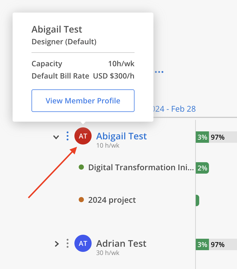 Hover on the member to see more details, including role, capacity, and bill rate (if any). Click View Member Profile to see the profile of this member.