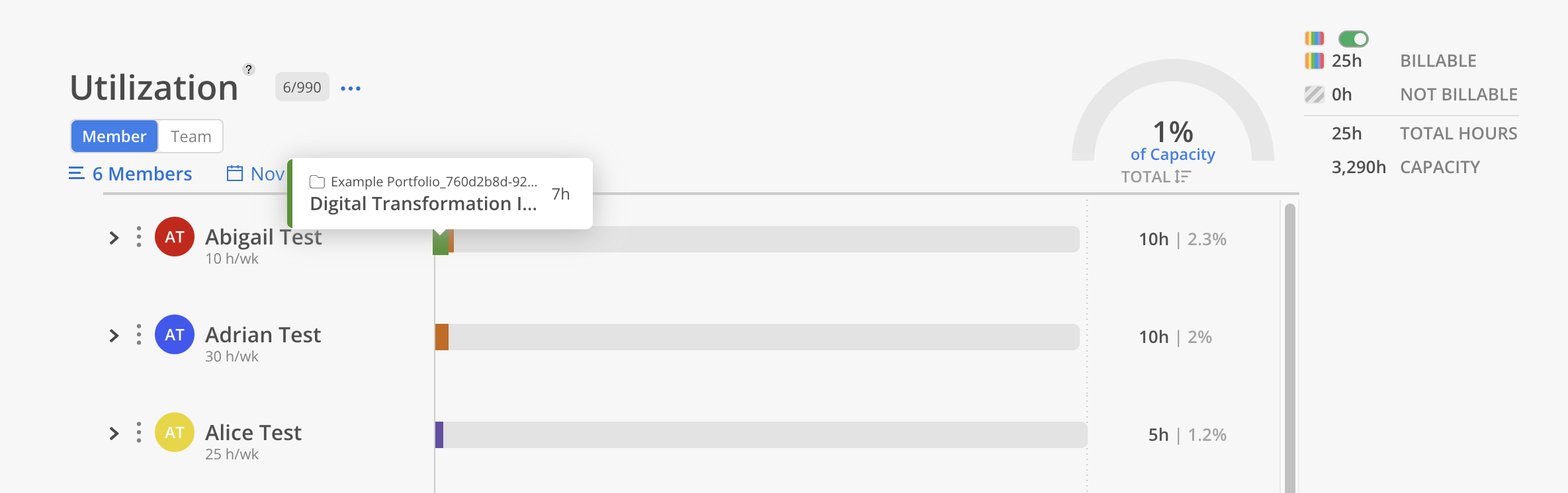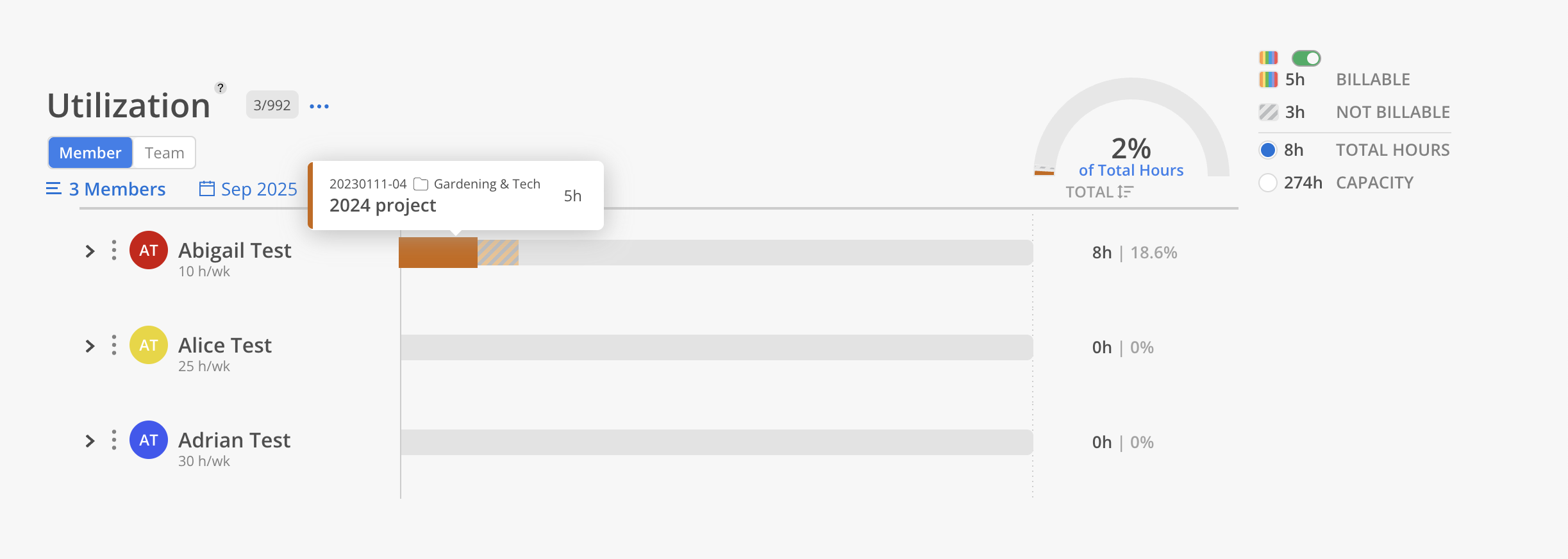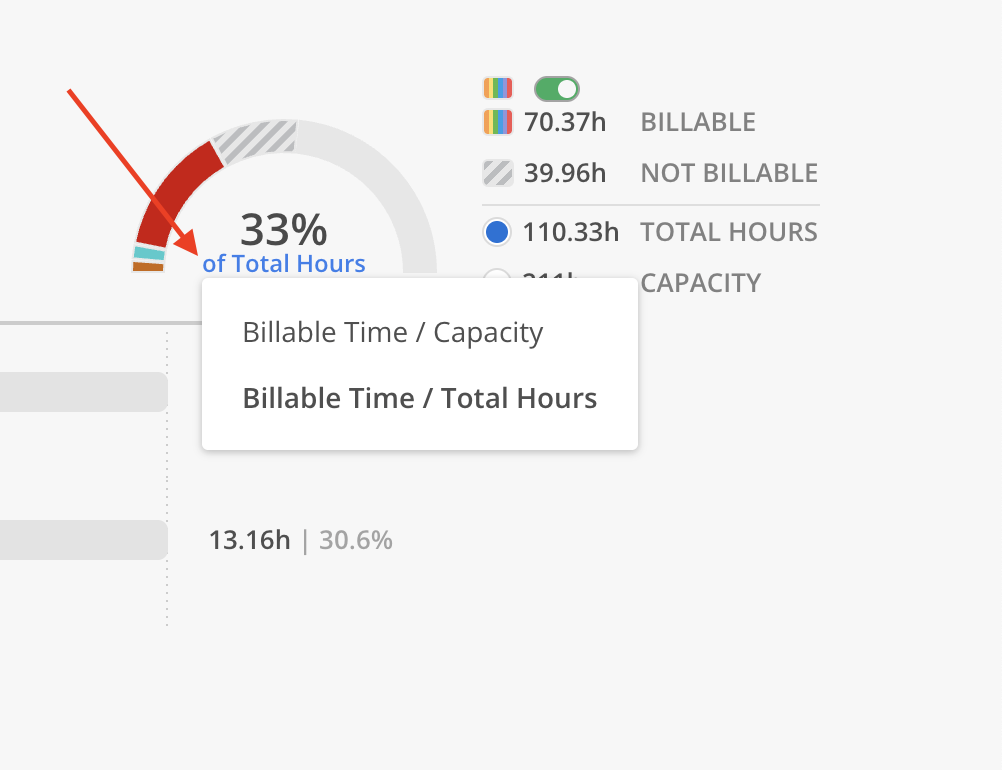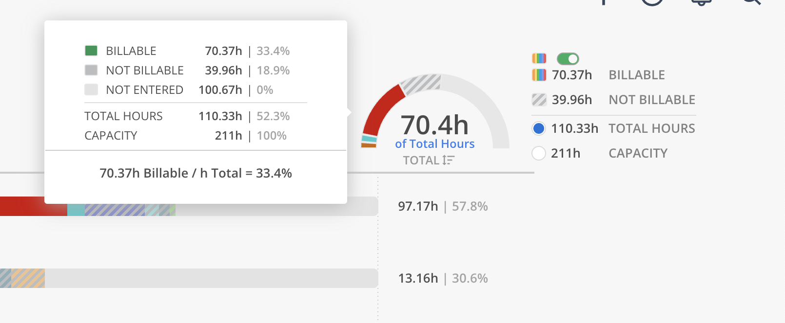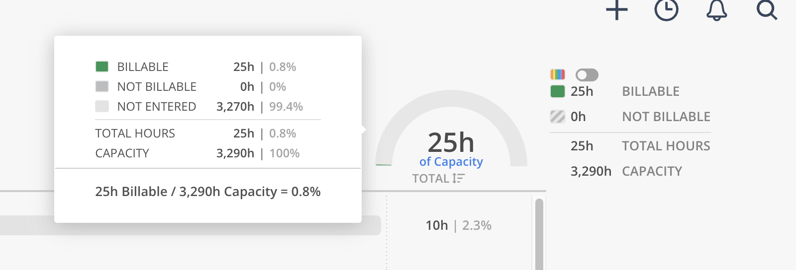 The summary widget at the top displays the percentage of billable time compared to capacity, by default. Hovering over the widget display a tooltip with detailed information, showing the total number of billable and non-billable hours. Time Off hours are included in these totals.