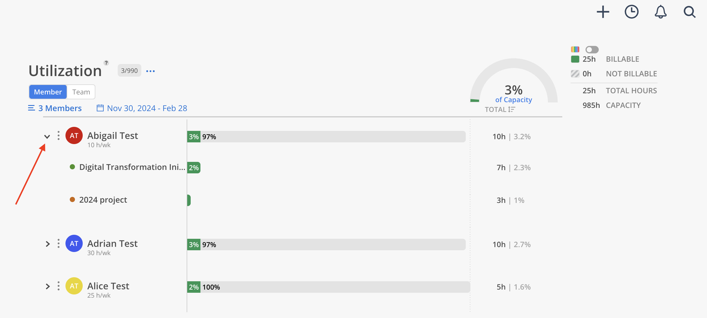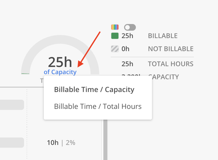 Click on the blue of Capacity button to change the calculation to shows the percentage of bill time versus total hours (billable + non billable)