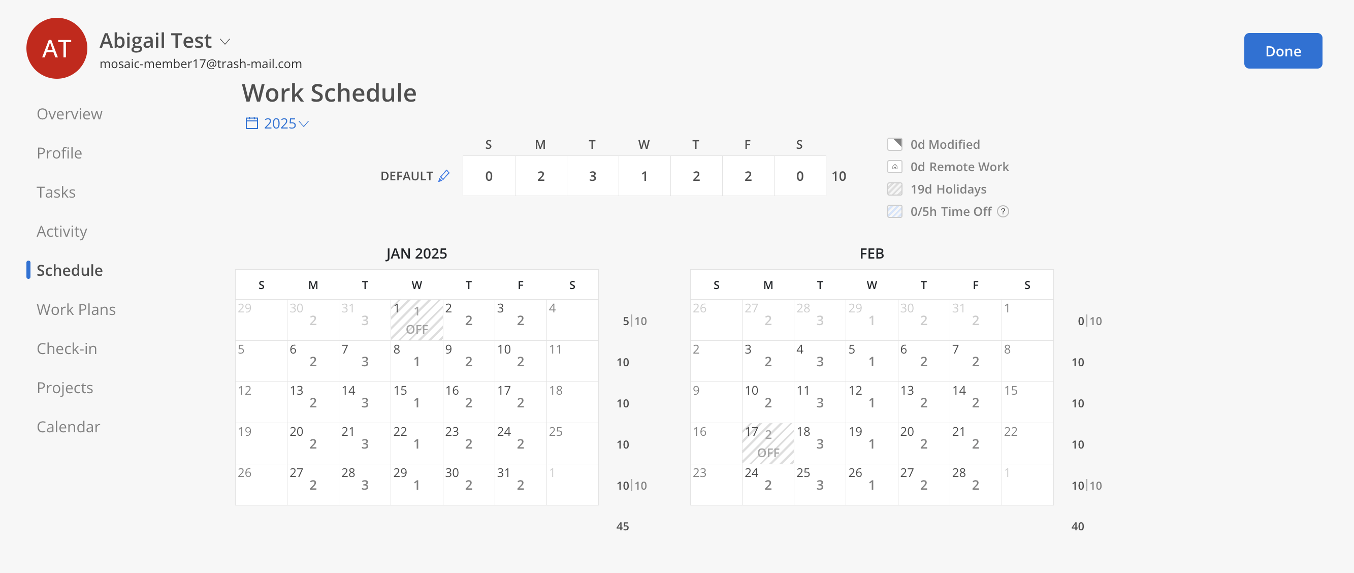 View Member Profile button opens Member Modal to Schedule page, which you can view the member's capacity and calendar of TO and holidays. Only Admins are able to edit the capacity of the member.