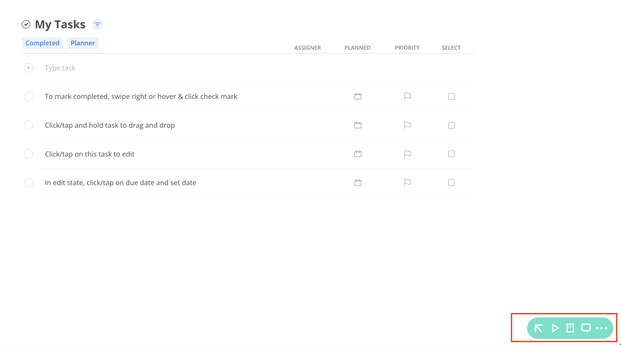Plays a brief video tutorial tailored to the current space. For example, if on the Home space, the video will cover features and functionality specific to that area.